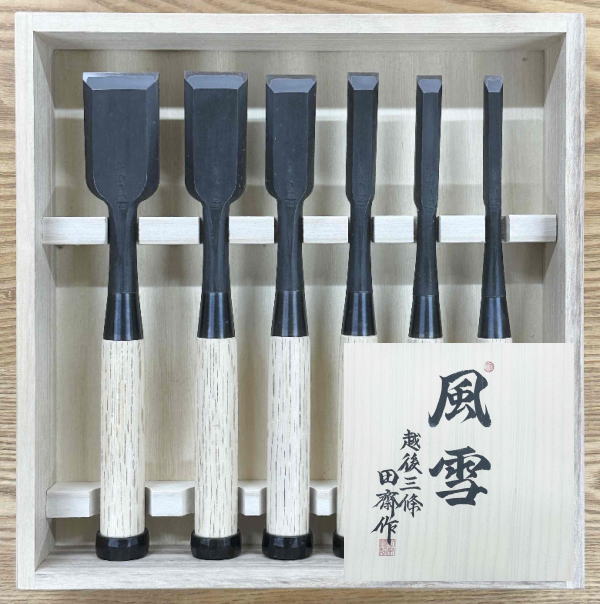 新潟県の三条市、田斎鑿(のみ)製作所製の風雪は息子さんとご主人が作られた追入鑿。色々な鑿を中心とした大工道具を作っておられ、田斎さんは三条を代表する鍛冶屋です。