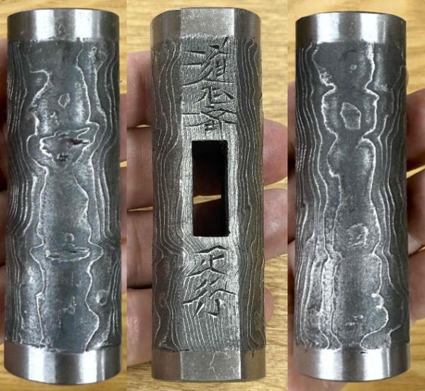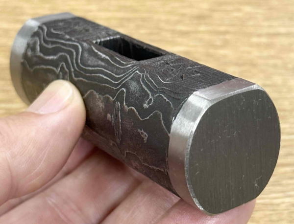 正行(まさつら)作の木目模様の一文字型の玄能です。木目の品は全て鋼付になります。黒と銀のコントラストが強い仕上がりの品。断面は側面が楕円、正面と裏側に平面があります。