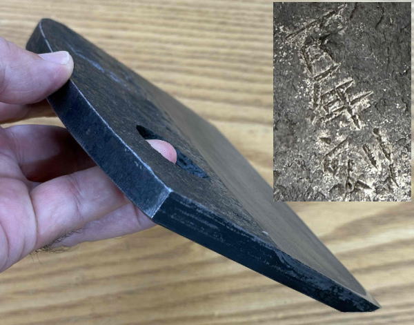 錬鉄は炭素量が少なく研ぎやすい地金で鉋の地金として最適な鉄です。穴の部分はハンマーで叩かれ伸ばされ、リアルに百年刻みの印象が伝わってきます。