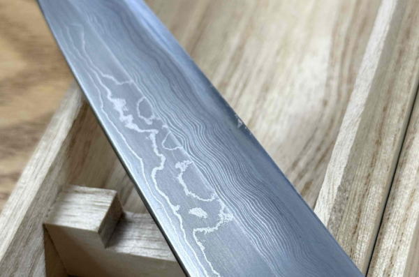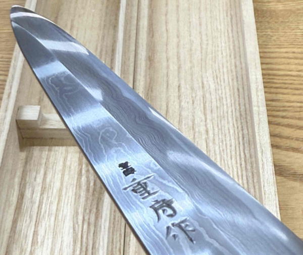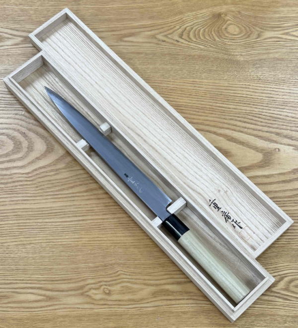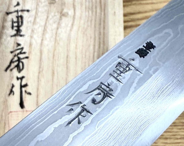 新潟県三条の銘工、重房の柳刃庖丁。地金は鍛え地を使用し美しく、不均等な紋様は手作りの証。手研ぎにより仕上げは表面が透けるような仕上がり。