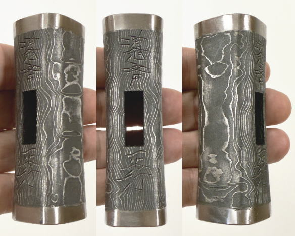 この杢目仕上げは、両端に鋼を鍛接、地金部分は積層鋼を使った美しい玄能、木の表面のように正面から見たら柾目、側面から見たらも木目模様が見えます。鋼付の品は道心斎正行のタガネによる作切入りの高価な逸品。