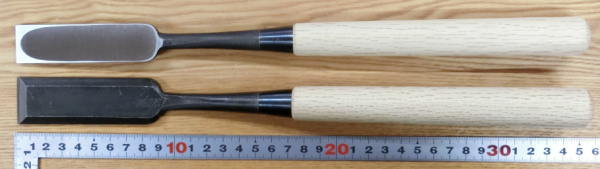 薄鑿は平面の部分でも突きやすいように軸をを少し反り気味に作り、柄を取り付けてあります。