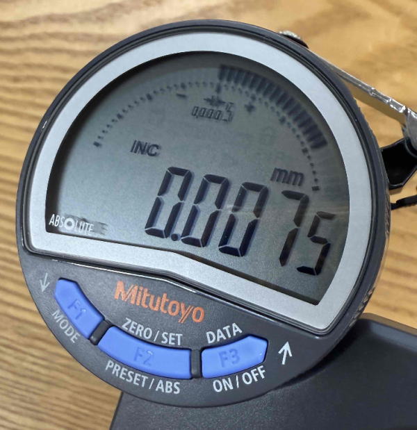 このシックネスゲージの表示量0.0005mmは、例として以前の機種での表示は、0.0006>0.0005でした。